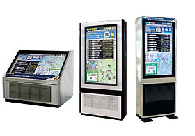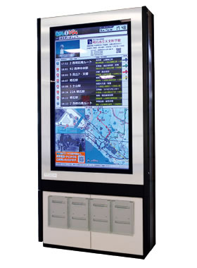 えきバスびじょん。は駅前表示サイネージとPC、モバイルの3種で案内するバス時刻表案内サービスです。関西を中心に設置個所はすでに10か所を超え、強固なハードウェア、安定した運用と高いデザイン性で好評を得ています。
